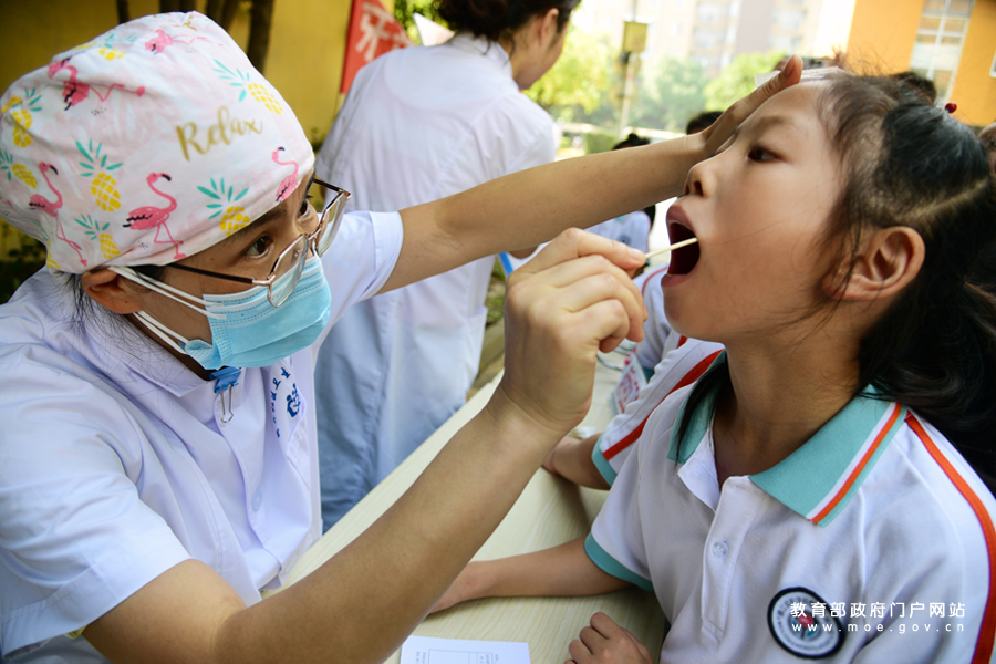 9月18日,鎮江市蔣喬社區衛生服務中心醫務人員在為小學生檢查牙齒健康狀況。(石玉成/攝)
