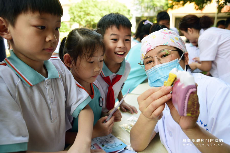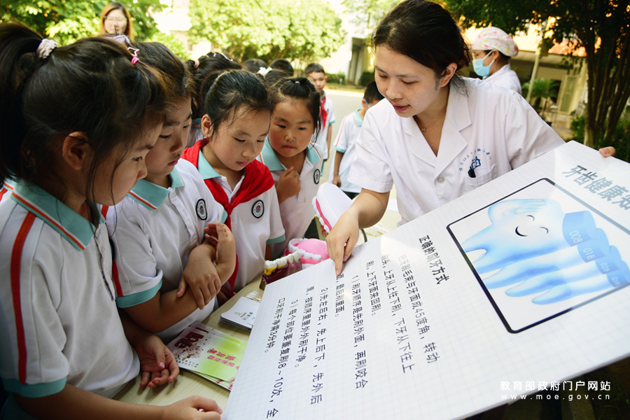 9月18日,鎮江市蔣喬社區衛生服務中心醫務人員在指導小學生學習正確的刷牙方法。當日,江蘇省鎮江市潤州區蔣喬社區衛生服務中心醫務人員來到鎮江實驗學校魅力之城分校,開展“愛牙護牙 從小做起”活動,為小學生檢查牙齒健康狀況,講解愛牙護牙知識,指導正確的刷牙方法,引導孩子們從小養成愛護牙齒的好習慣,迎接“全國愛牙日”的到來。(石玉成/攝)
