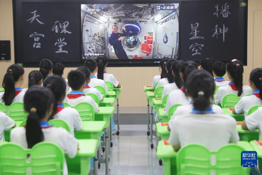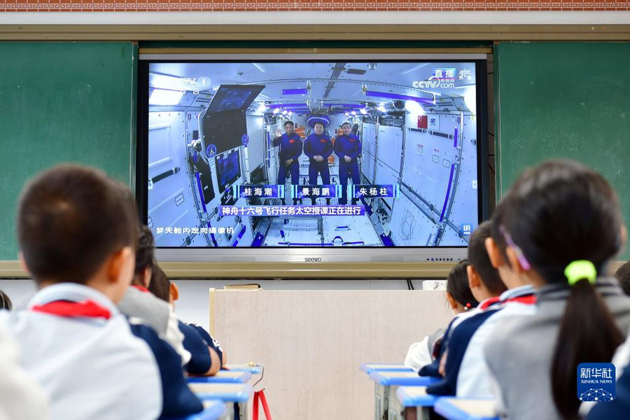 1/09月21日,在北京航空航天大學,學生收看“天宮課堂”第四課。“天宮課堂”第四課在中國空間站正式開講,神舟十六號航天員景海鵬、朱楊柱、桂海潮進行授課。本次太空授課活動繼續(xù)采取天地互動方式進行,共設立北京航空航天大學等5個地面課堂。3名航天員將在軌展示介紹中國空間站夢天實驗艙工作生活場景,演示球形火焰實驗、奇妙“乒乓球”實驗、動量守恒實驗以及又見陀螺實驗,并與地面課堂進行互動交流。(新華社記者 鞠煥宗/攝)
