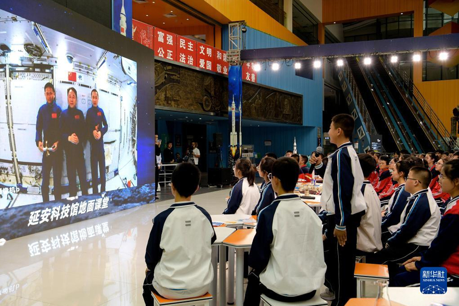 1/09月21日,在陜西延安科技館“天宮課堂”第四課地面課堂,學生在向航天員提問。(新華社發(fā) 鄧志宏/攝)