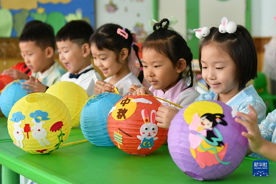 9月27日,山東省煙臺市福山區清洋街道中心幼兒園的小朋友在制作中秋花燈。(新華社發 孫文潭/攝)
