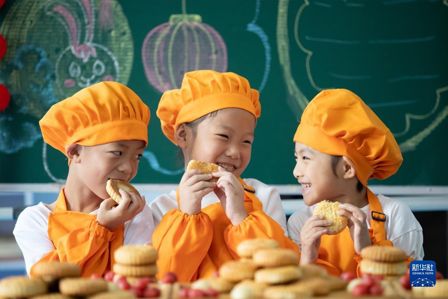 9月27日,河北省邯鄲市肥鄉區肥鄉鎮第二幼兒園的小朋友在品嘗自己親手制作的月餅。(新華社發 薛建東/攝)