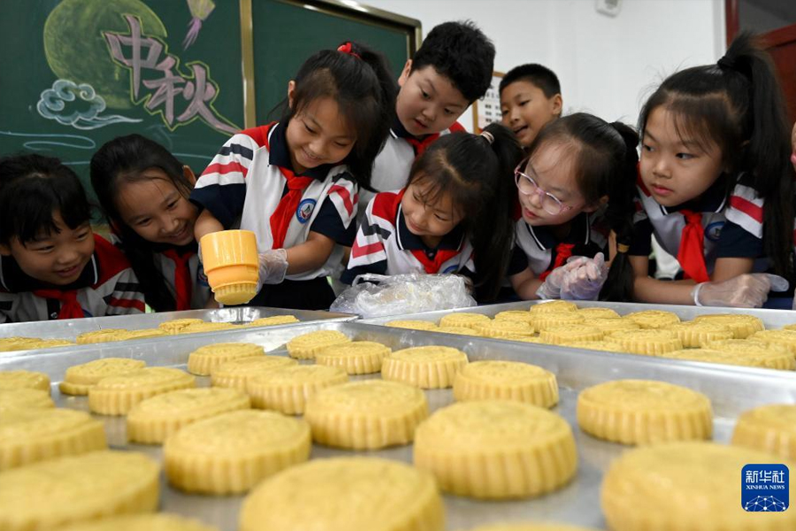 9月27日,河北省邯鄲市邯山區實驗中學小學部的學生在制作月餅。(新華社發 郝群英/攝)