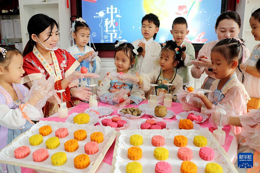 9月27日,在山東省東營市東營區實驗幼兒園,學生在老師的指導下體驗制作月餅。(新華社發 劉智峰/攝)