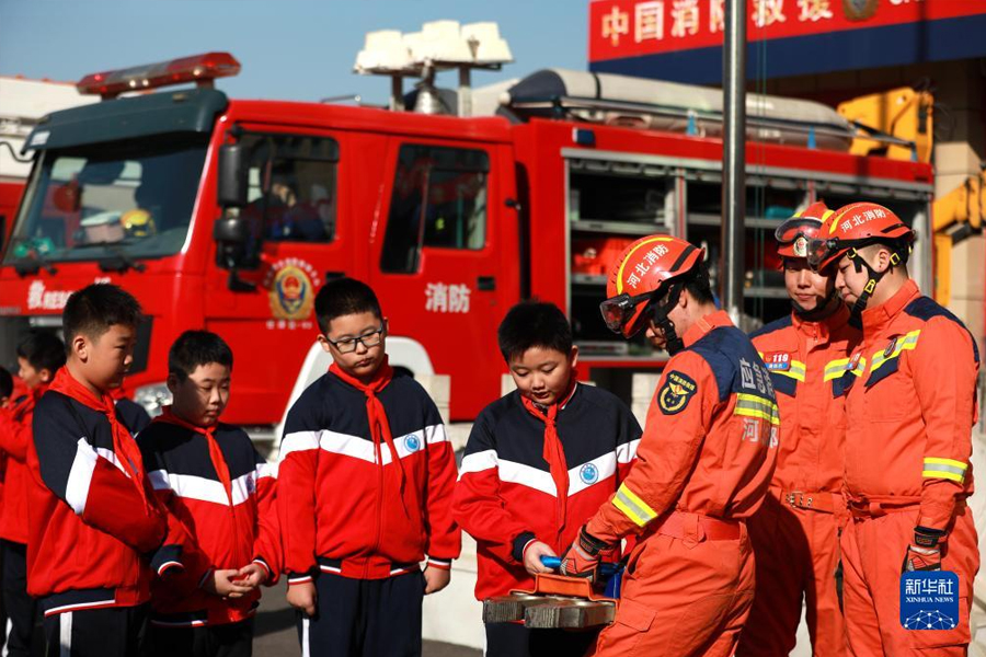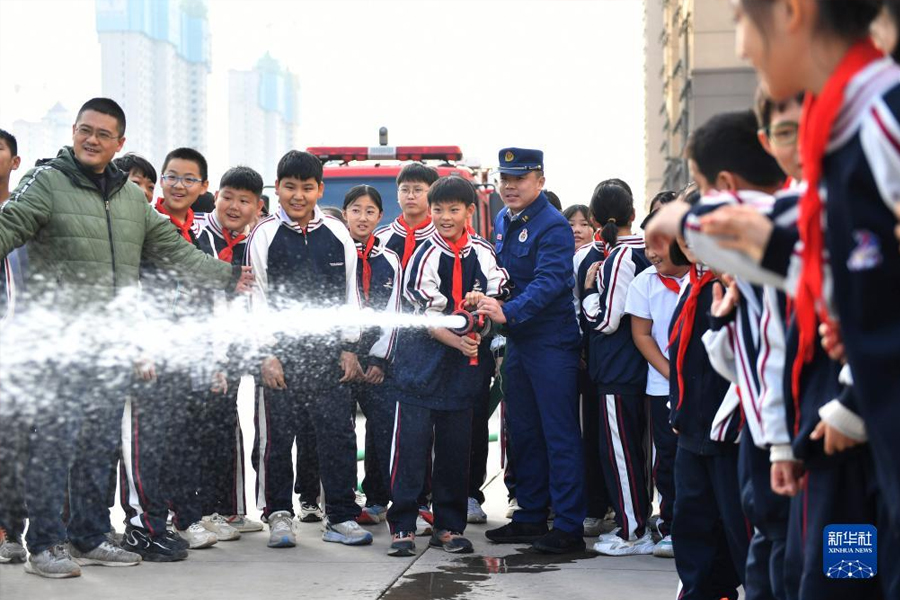 11月7日,河北省邢臺市任澤區昌平路小學的學生體驗使用消防救援器材。(新華社發 宋杰/攝)