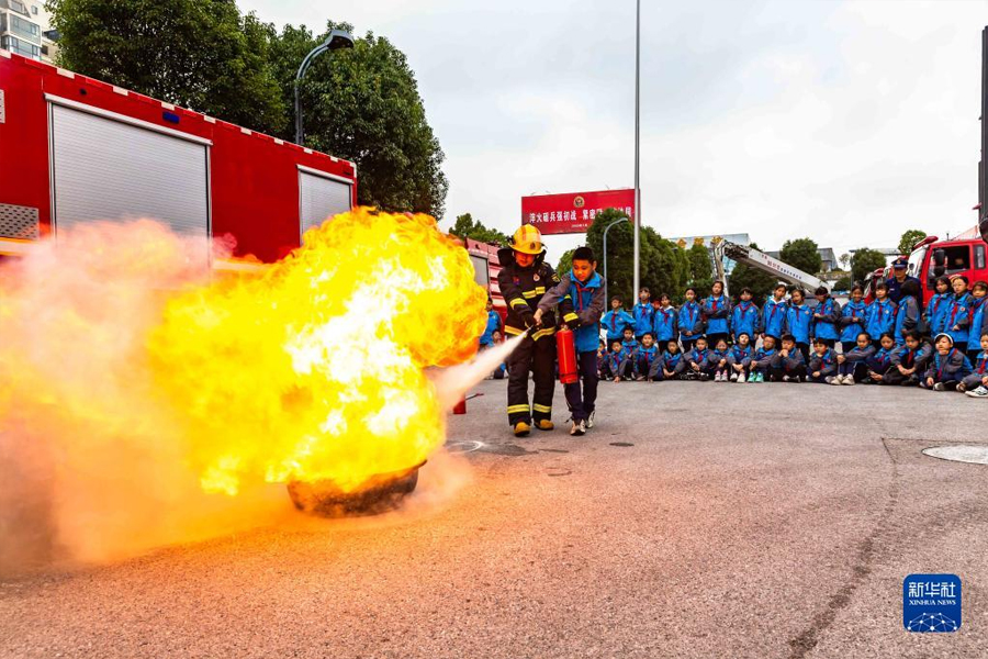 11月7日,貴州省安順市第七小學的學生在消防救援人員指導下學習使用滅火器滅火。(新華社發 陳熙/攝)