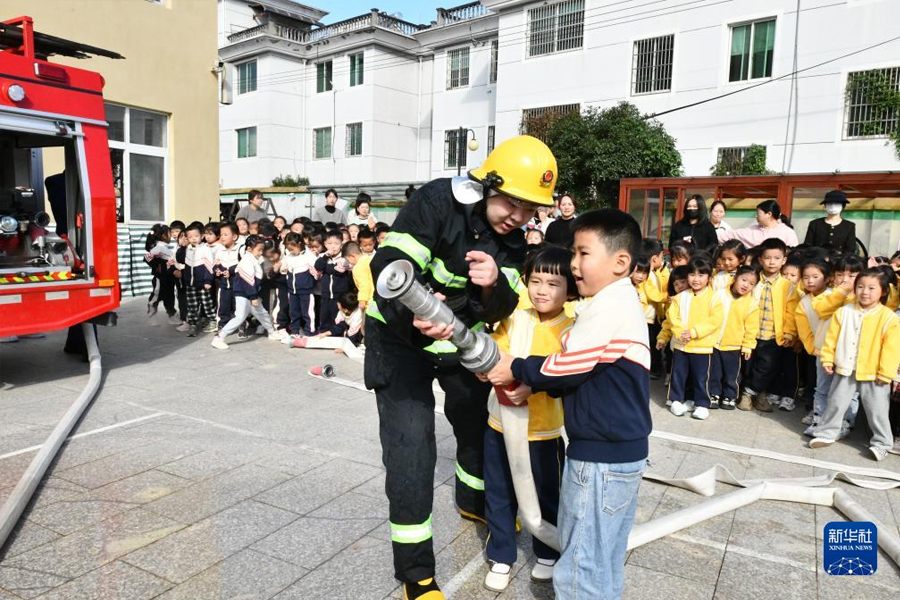 11月7日,浙江省建德市楊村橋鎮消防隊員給楊村橋中心幼兒園的孩子們講解消防水槍使用方法。(新華社發 寧文武/攝)