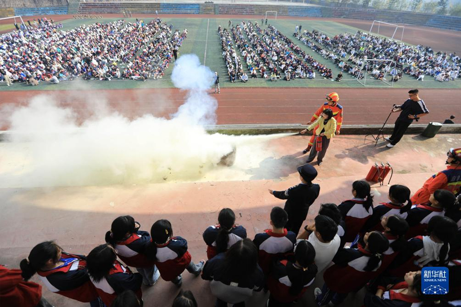 11月7日,在貴州省赤水市中等職業學校,消防救援隊員指導師生學習滅火器的使用方法。(新華社發 王長育/攝)