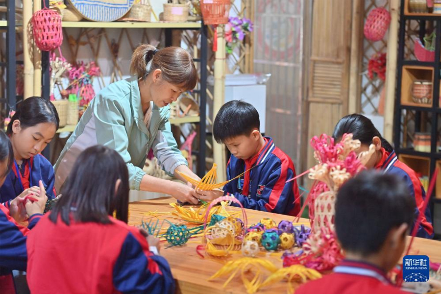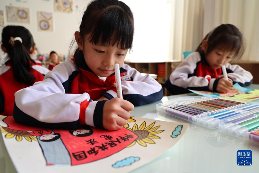 12月4日,山東省濱州市渤海中學小學部的學生在繪制以國家憲法日為主題的手抄報。(新華社發 初寶瑞/攝)