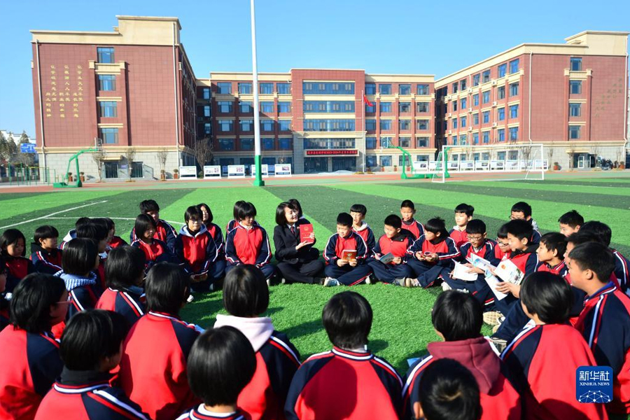 12月4日,在山東省棗莊市市中區文化路小學,法官給學生講解憲法知識。(新華社發 孫中喆/攝)