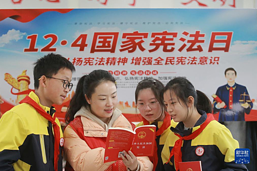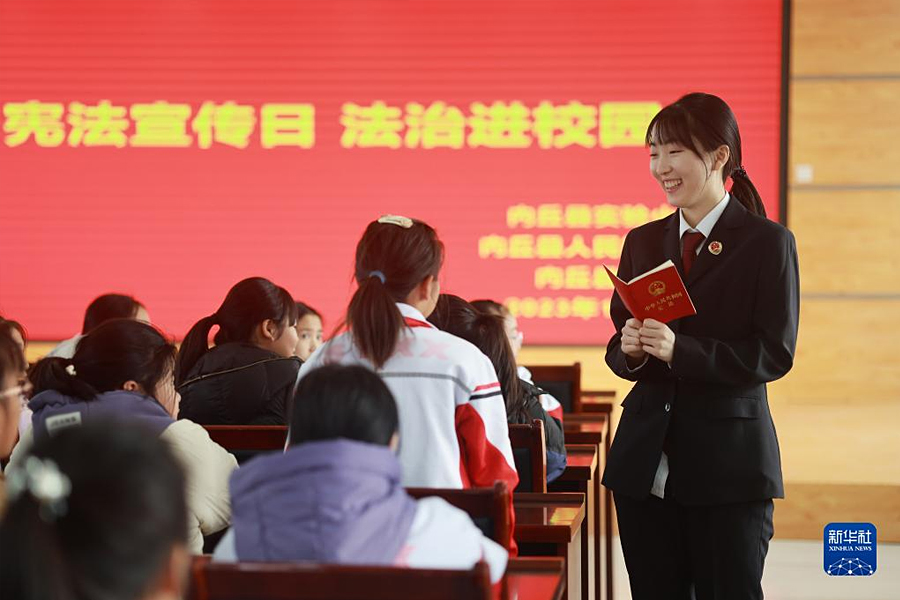 12月4日,在河北省邯鄲市成安縣第七中學東城校區,成安縣檢察院工作人員給學生講解憲法知識。當日是第十個國家憲法日,各地舉辦多種形式的活動弘揚憲法精神,提升公民法治素養。(新華社記者 王曉/攝)