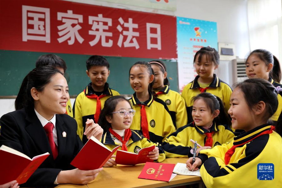 12月4日,在河北省邢臺市內丘縣實驗小學,檢察院工作人員與學生互動學習憲法知識。(新華社發 劉繼東/攝)