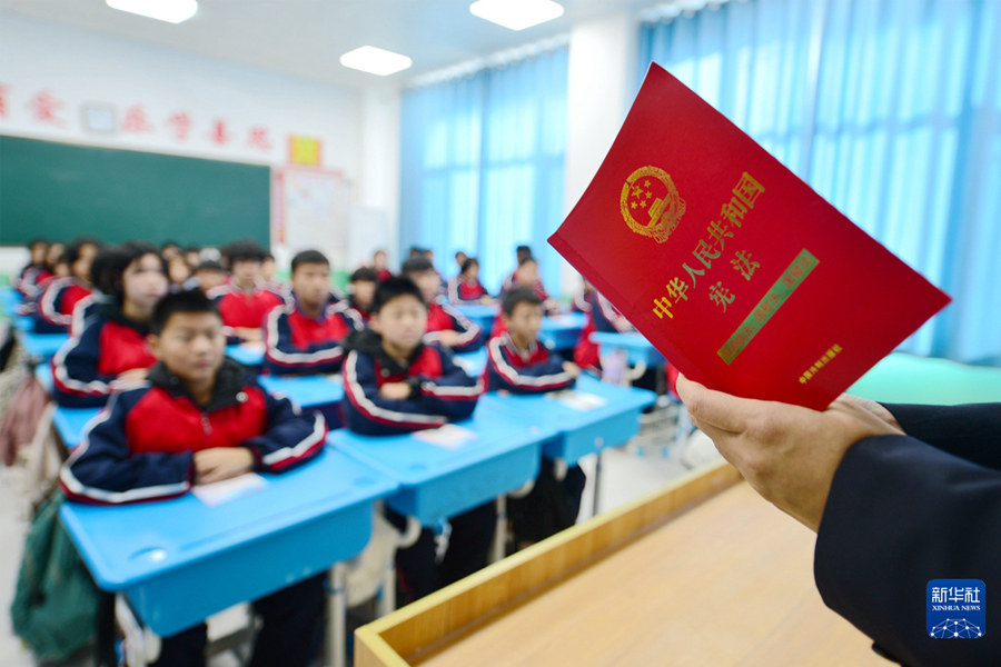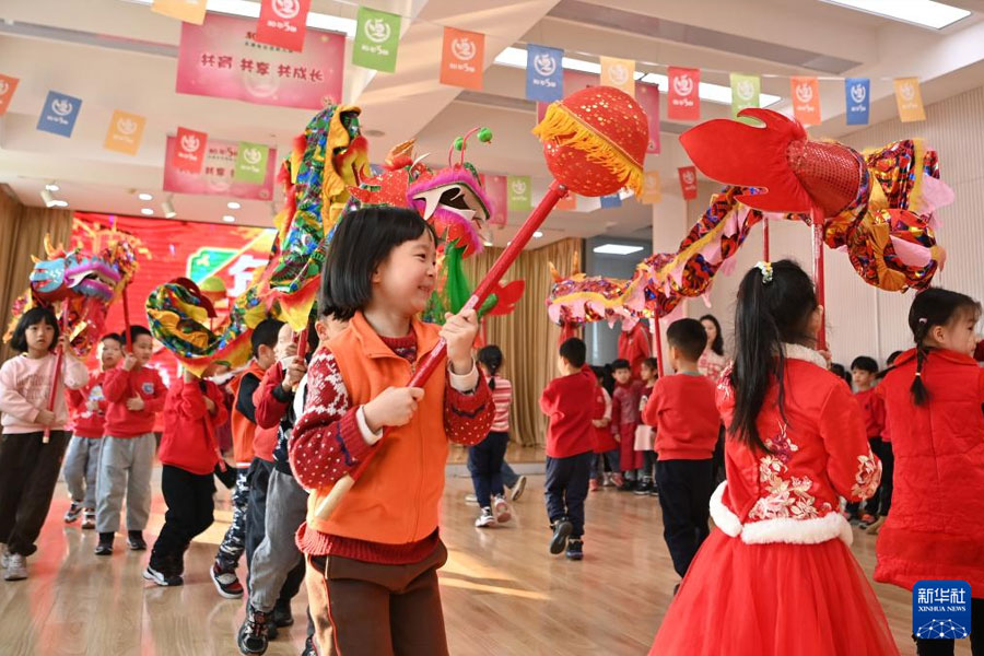 12月29日,天津市和平區第五幼兒園的小朋友在教室里舞長龍。(新華社記者 李然/攝)