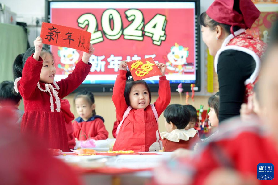 12月29日,山東省臨沂市郯城縣郯城街道官塘幼兒園的老師手持“你好2024”字樣,和孩子們一起迎接新年。2024年新年臨近,各地舉行各種文化活動喜迎新年。(新華社發 張春雷/攝)