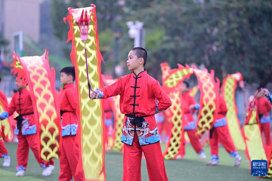 12月29日,江西省贛州市章貢區第二小學的學生表演舞龍。(新華社發 胡江濤/攝)