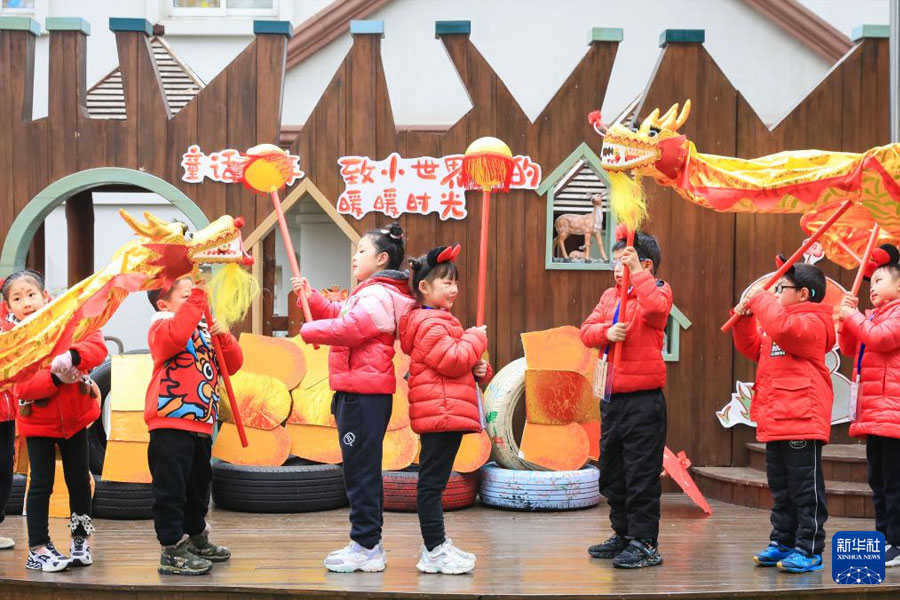 12月29日,南京市雨花臺區普德村幼兒園的小朋友表演舞龍。(新華社發 蘇陽/攝)