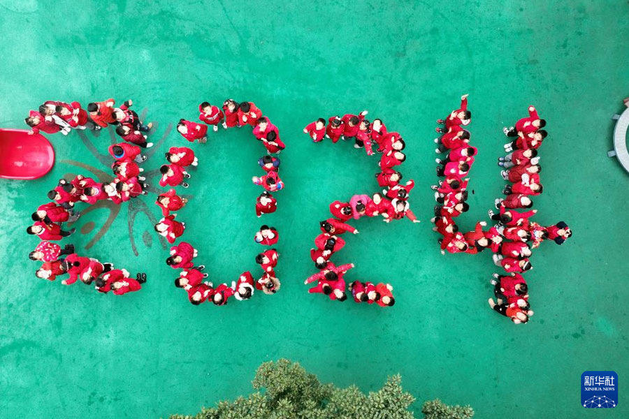 12月29日,江蘇省常州市鐘樓區科技實驗幼兒園的小朋友在操場上擺出“2024”的造型。(新華社發 陳暐/攝)
