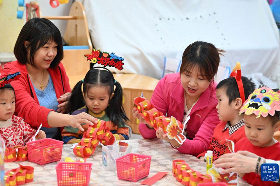 12月29日,天津市和平區第五幼兒園的老師帶著孩子做手工迎新年。(新華社記者 李然/攝)