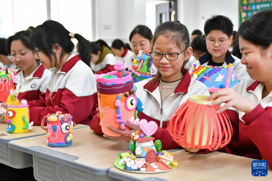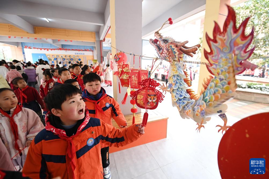 1/02月26日,湖北省襄陽(yáng)市海容小學(xué)學(xué)生在校園觀賞剪紙繪畫(huà)燈籠等作品。(新華社發(fā) 謝勇/攝)